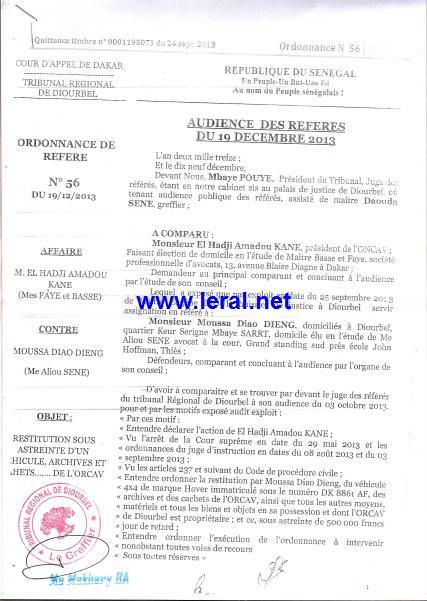 C'est le énième rebondissement d'une bataille judiciaire vieille de deux ans. En effet, suite au conflit de l'ONCAV , malgré son inculpation par le juge du premier cabinet d'instruction pour le délit de faux et usage de faux , El Hadji Amadou Kane, président de l"ONCAV avait saisi le juge des référés pour lui demander de constater que Moussa Diaw Dieng n'est plus le président de l'ORCAV de Diourbel et d'autre part d'ordonner que ce dernier lui restitue le véhicule de fonction DK 8869 AF que l'ONCAV a mis à sa disposition ainsi que les cachets ,matériels et documents administratifs de l"ORCAV de Diourbel.